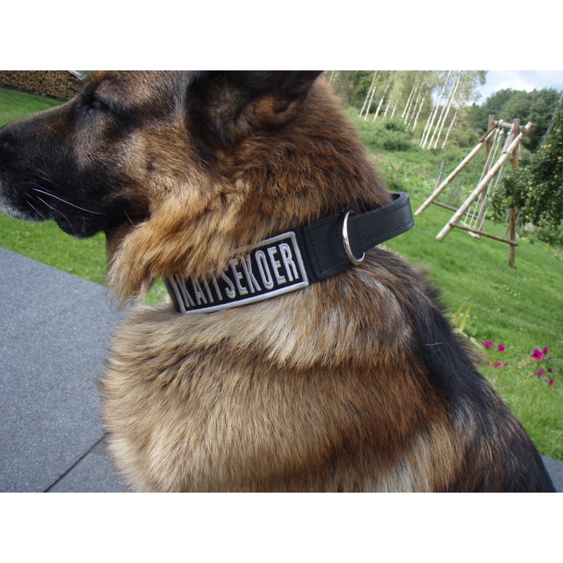 Soft leather collar with leather handle. 50mm wide.